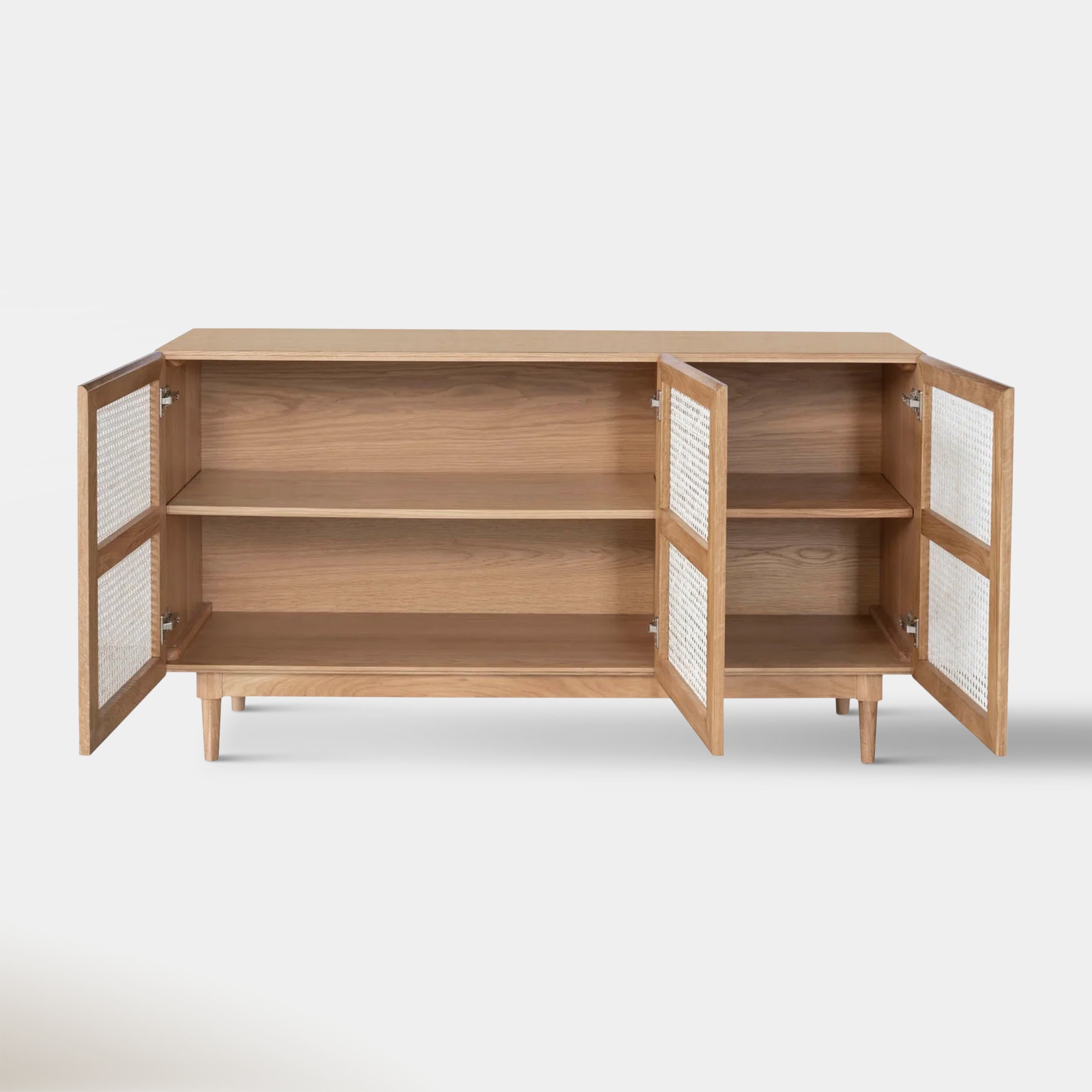 The sideboard includes three doors with internal shelving and three drawers, offering ample storage options.