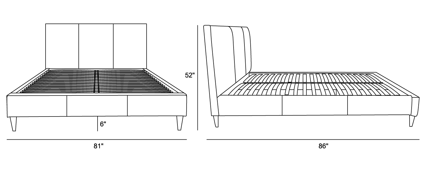 The Draft#34 King Bed includes a sturdy platform slat system with 19 horizontal slats and center support legs, eliminating the need for a box spring.