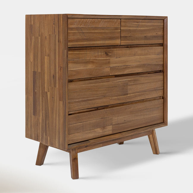 To maintain the luxurious look of your Soleil 5 Drawer Chest, regularly dust the wood to remove debris. For spills and stains, wipe clean immediately with a mild detergent and a damp cloth. Avoid harsh chemicals or abrasive cleaners to preserve the wood's quality.