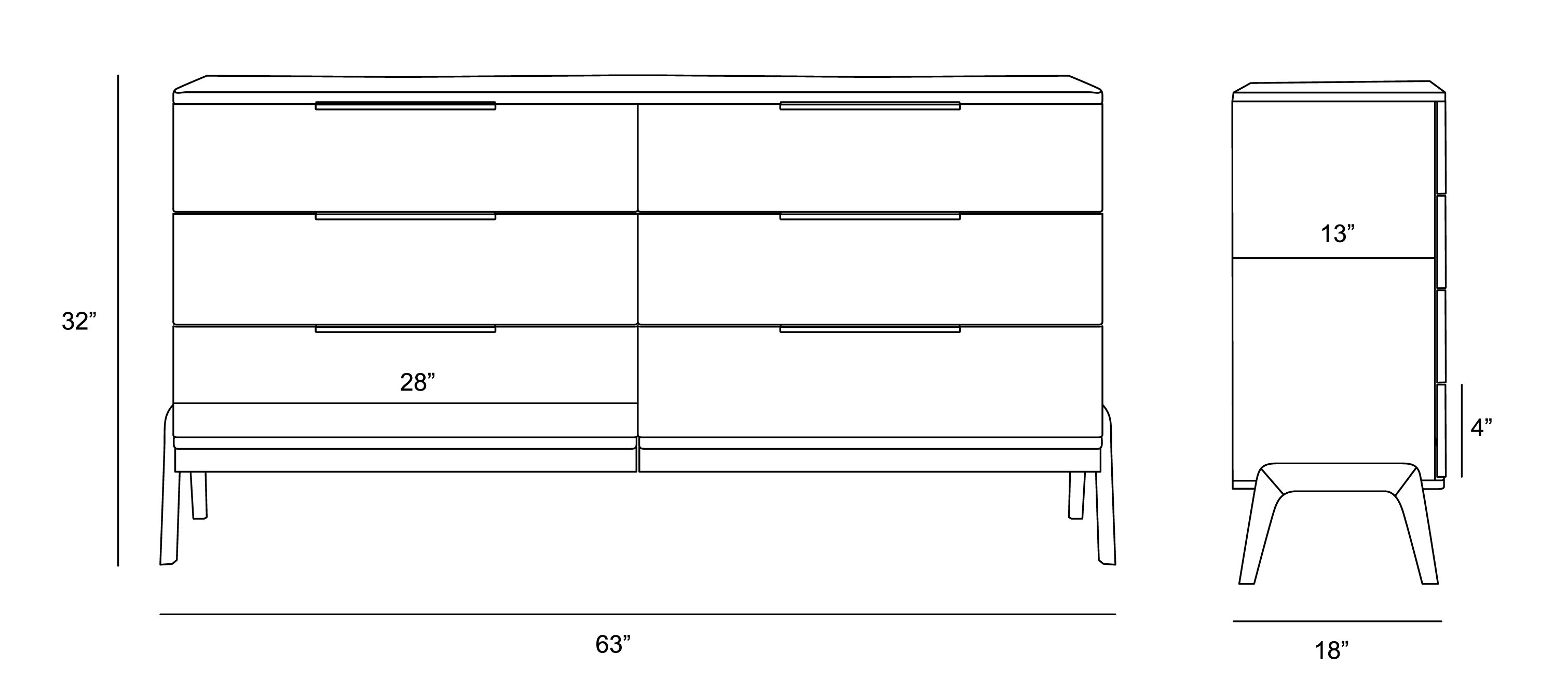 Each drawer of the Mikael 6 Drawer Dresser has storage dimensions of 27.5 inches in width, 13.25 inches in depth, and 4.1 inches in height.